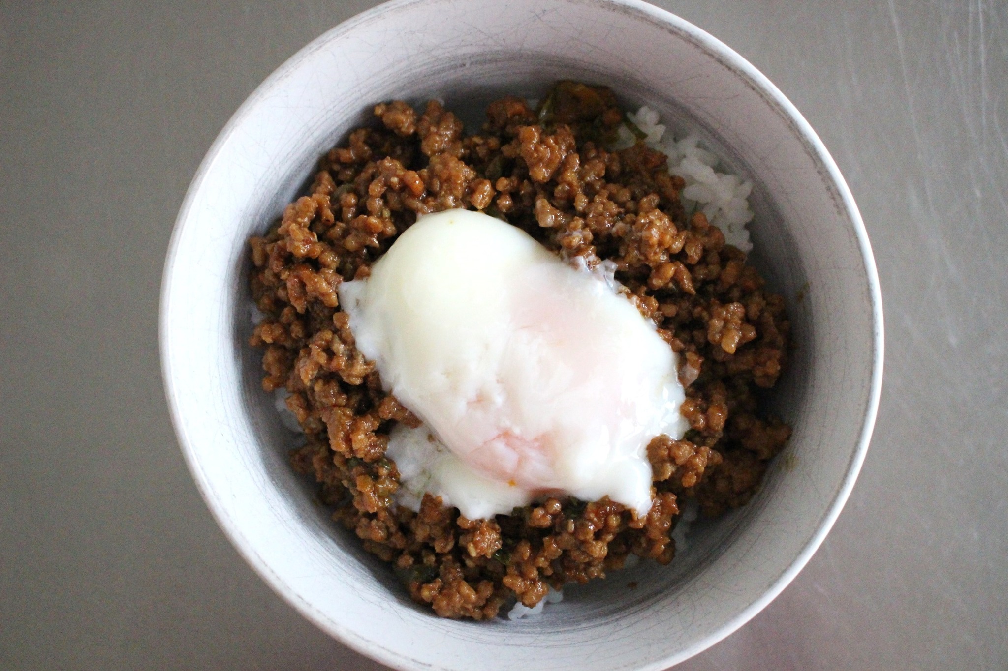 ⑥水分が減ってきたら、白ご飯の上にのせて温泉卵をトッピングする。