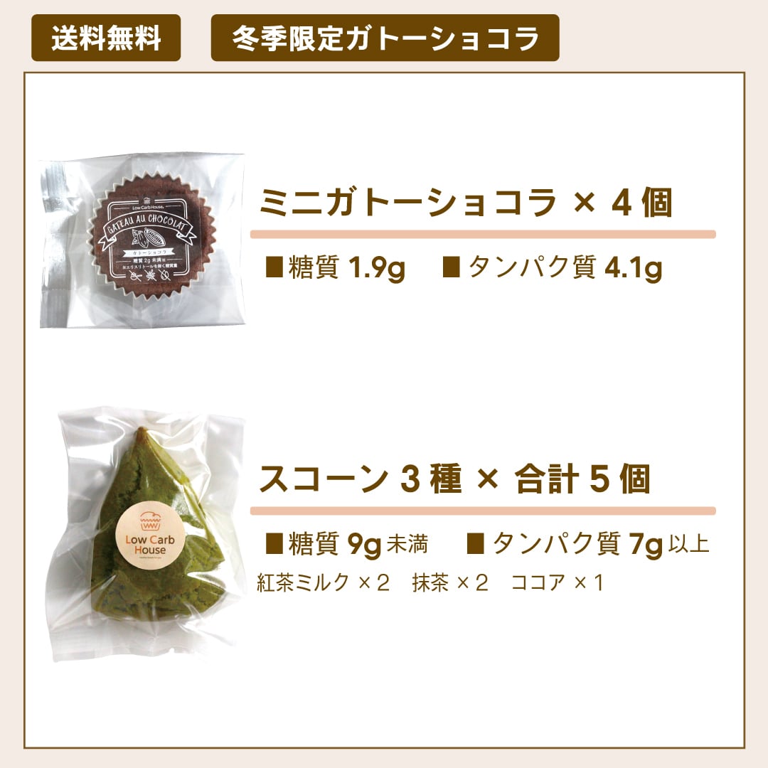 セット内容はミニガトーショコラ4個、紅茶ミルクプロテインスコーン2個、抹茶プロテインスコーン2個、ココアプロテインスコーン1個になります。