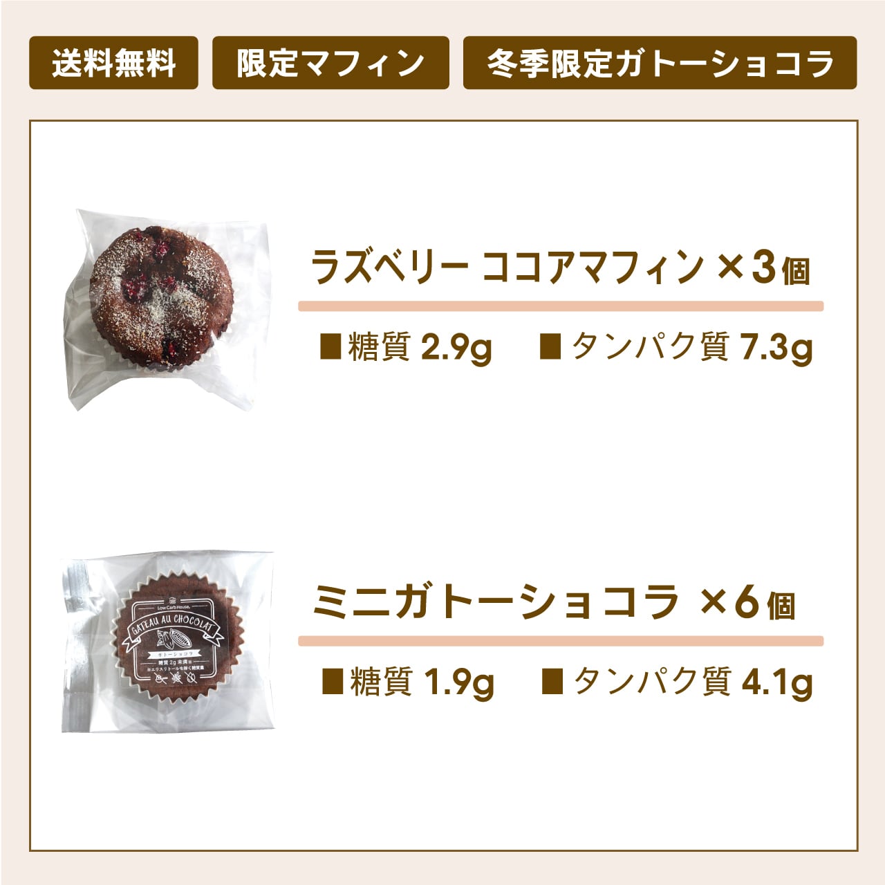 卵(国産)、クリームチーズ、エリスリトール、ラズベリー、アーモンドパウダー、バター、グラスフェッドプロテイン、ココアパウダー、難消化性デキストリン、米粉、有機ココナッツ/ベーキングパウダー、甘味料(ステビア)(一部に卵、乳成分、アーモンドを含む)