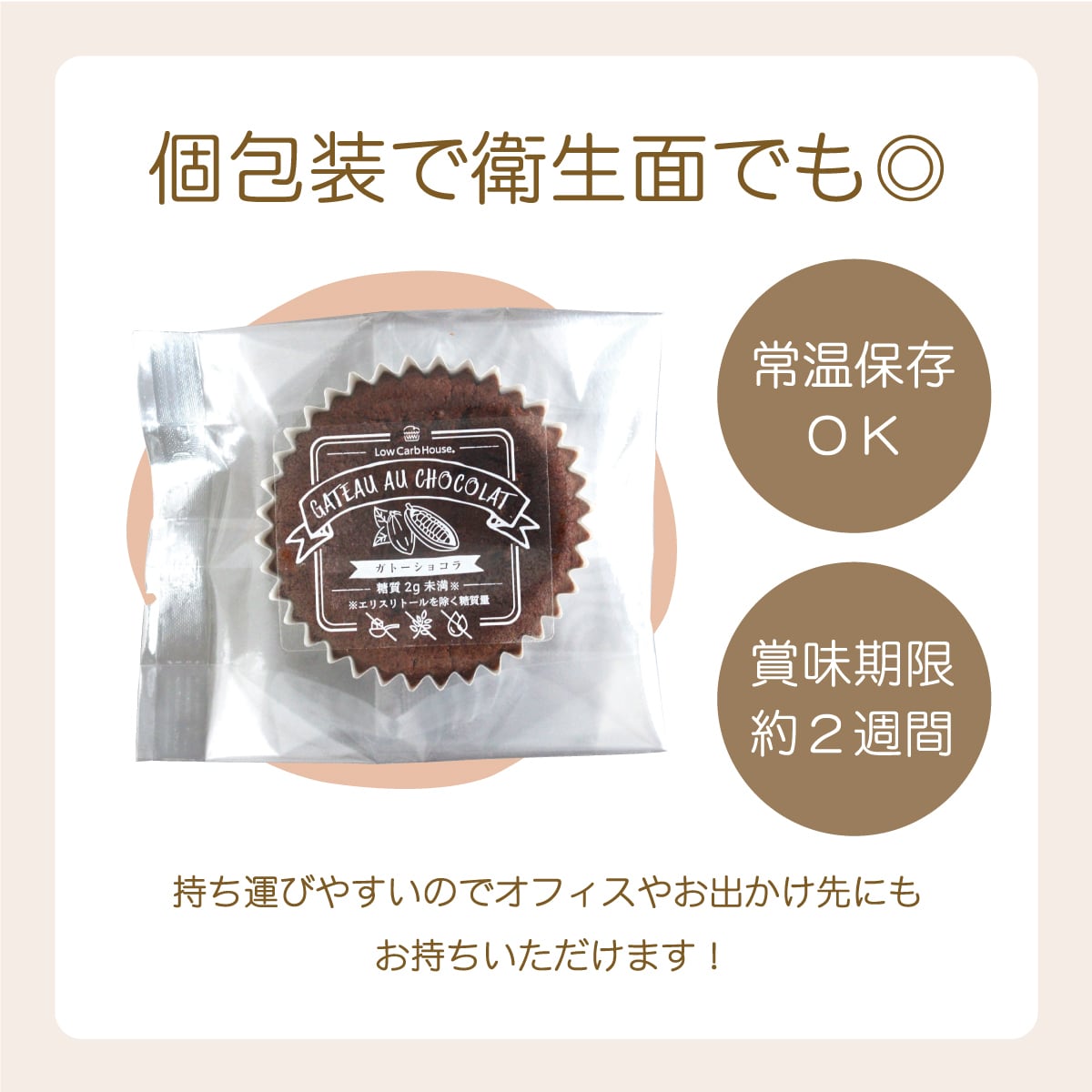 卵(国産)、クリーム、クリームチーズ、バター、エリスリトール、アーモンドパウダー、ココアパウダー、グラスフェッドプロテイン、難消化性デキストリン、米粉、天然塩/甘味料(ステビア)(一部に卵・乳成分・アーモンドを含む)